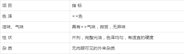 (二)感官指标的表述除应符合上述一般规定外,根据产品形态、剂型的不同,其色泽、性状项描述还应符合下表规定: